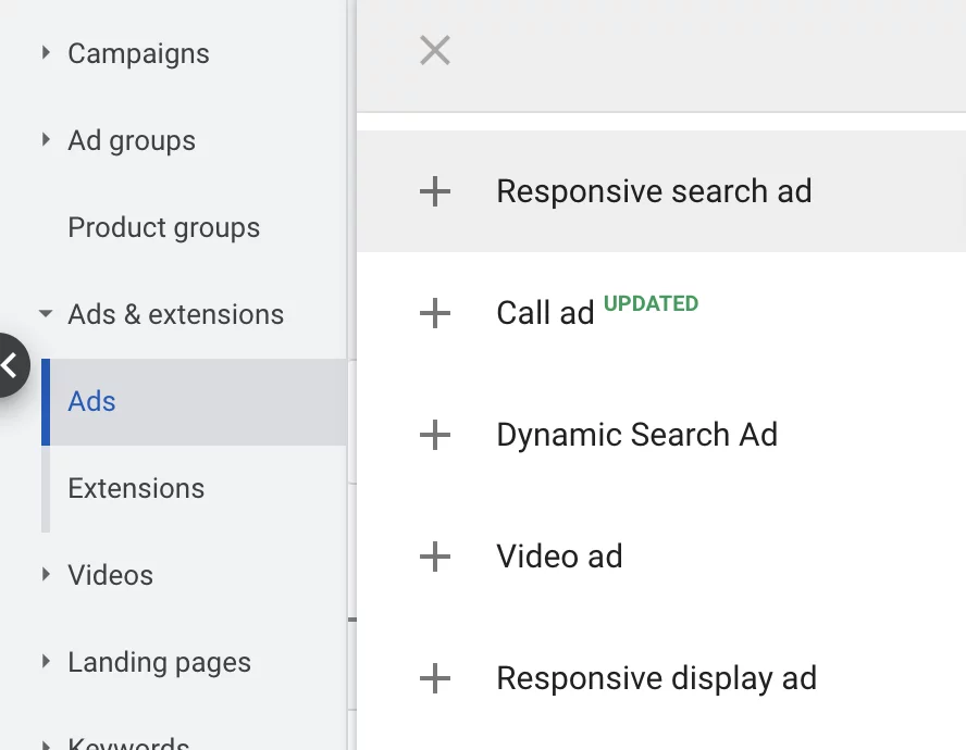 Um eine RSA zu erstellen, müssen Sie in Ihrem Google Ads-Konto auf der Registerkarte „Anzeigen und Erweiterungen“ auf das große blaue +-Symbol klicken und „Responsive Suchanzeige“ auswählen.