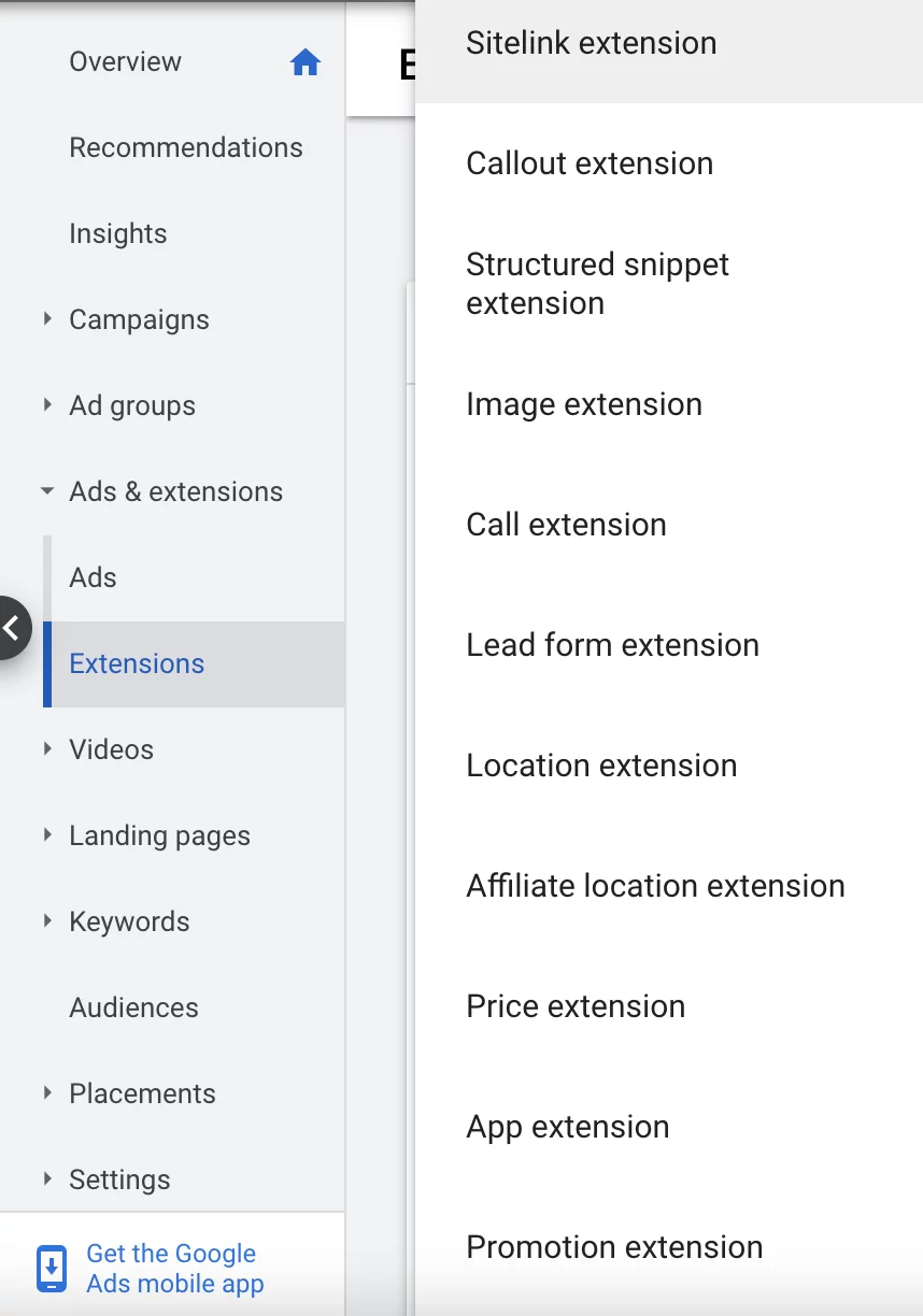 Anzeigenerweiterungen können auf RSAs genauso verwendet werden wie auf erweiterten Textanzeigen. Sie können Ihre vorhandenen Anzeigenerweiterungen verwenden oder neue erstellen, stellen Sie jedoch sicher, dass Sie sie verwenden. Um Anzeigenerweiterungen hinzuzufügen, gehen Sie zur Registerkarte „Erweiterungen“ und klicken Sie auf das große blaue +-Symbol. Sie können dann die Art der Anzeigenerweiterung auswählen, die Sie verwenden möchten.