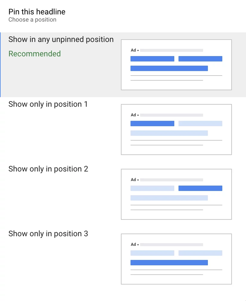 Sie können die relevantesten Überschriften und Beschreibungen in responsiven Suchanzeigen an eine bestimmte Position wie Überschrift 1 anheften. Verstehen Sie mich nicht falsch, dies ist eine sehr nützliche Funktion. Denken Sie daran, dass jedes Mal, wenn Sie eine Überschrift oder Beschreibung pinnen, die Anzahl der möglichen Kombinationen, die der Algorithmus testen muss, begrenzt ist. Wenn es eine Überschrift gibt, die Sie immer an einer bestimmten Position in Ihren Anzeigen zeigen möchten, dann heften Sie sie auf jeden Fall an, aber tappen Sie nicht in die Falle, jede Platzierung kontrollieren zu wollen maschinelles Lernen kann Ihnen sagen, welche Schlagzeilen wo sein sollten.