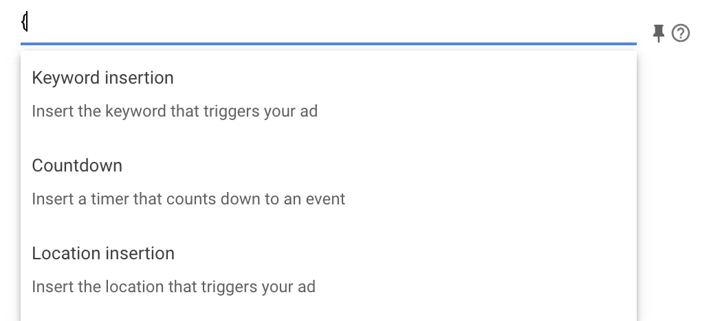 Genau wie bei erweiterten Suchanzeigen können Sie Anzeigenanpassungen in den Schlagzeilenfeldern verwenden, um Ihren Anzeigentext mit Keyword-Einfügung besser auf den Suchbegriff eines Benutzers abzustimmen. Sie können auch einen Countdown zur Verkaufsförderung oder einen bestimmten Standort hinzufügen, wenn Ihre Anzeigen eine bestimmte geografische Ausrichtung verwenden. Um einen Customizer zu erstellen, müssen Sie mit dem offenen Klammersymbol „{“ beginnen.