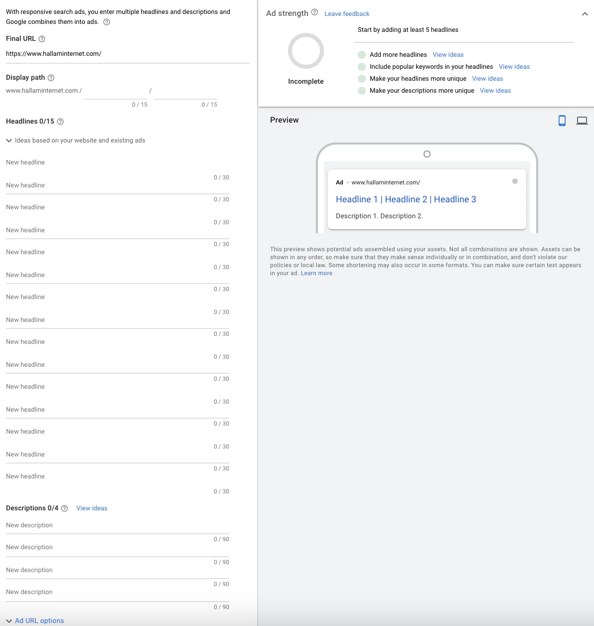 Dadurch gelangen Sie in den RSA-Bearbeitungsmodus. Sie müssen eine Reihe von Feldern ausfüllen, genau wie bei erweiterten Textanzeigen, nur werden Sie feststellen, dass Sie in RSAs mehr Anzeigentitel- und Beschreibungsfelder haben als in erweiterten Textanzeigen.