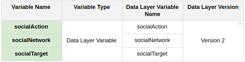 - Jetzt müssen Sie drei Variablen erstellen, damit Google Analytics erfährt, welche Art von Aktion der Klick ausgelöst hat, um welchen Social-Media-Kanal es sich handelt und was als Ergebnis des Klicks passiert.