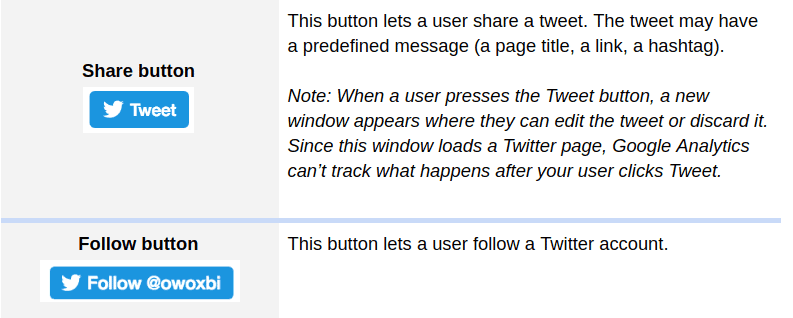 Wenn Sie Twitter-bezogene Schaltflächen auf Ihrer Website haben, können Sie deren Leistung mit Google Analytics verfolgen und analysieren.