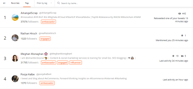 Mit AgoraPulse können Sie Ihr Publikum filtern, um zu sehen, wer von Ihren Followern das größte Publikum hat und am meisten mit Ihren Inhalten interagiert. Das Tool ermöglicht es Ihnen grundsätzlich, alle Influencer, die Ihnen auf Twitter folgen, automatisch zu identifizieren.
