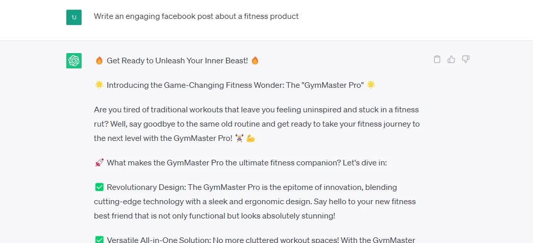 Unabhängig davon, ob Sie Affiliate-Kampagnen über eine Facebook-Seite, ein Instagram-Konto oder einen TikTok-Kanal bewerben, können Sie ChatGPT bitten , Bildunterschriften, Produktionsbeschreibungen und eingängige Phrasen zu erstellen.