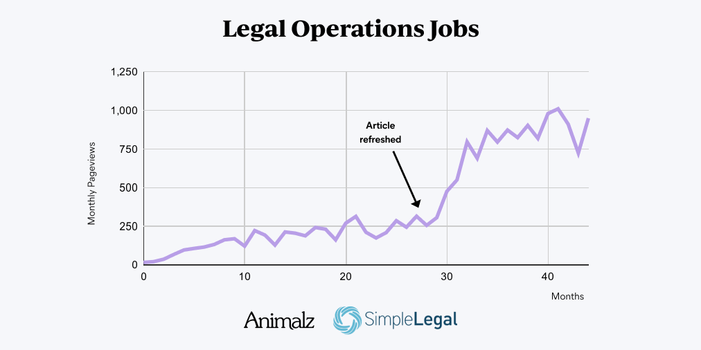 Was sind legale Operationen? wurde von einem einfachen Definitionsartikel erweitert, um einen größeren historischen Kontext und aktuelle Daten einzubeziehen – die Entwicklung der Rechtsabteilung im Laufe der Zeit und Untersuchungen, die die Anzahl der Rechtsabteilungsexperten in einem durchschnittlichen Rechtsteam zeigen. Diese Aktualisierungen trugen dazu bei, die monatlichen Seitenaufrufe nach der Aktualisierung von 256 auf 1.013 zu steigern.