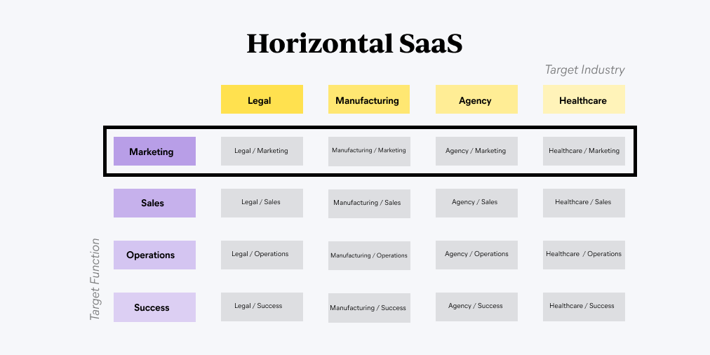 Viele Softwareunternehmen sind „horizontale SaaS“: Produkte, die bei bestimmten Geschäftsfunktionen – wie Marketing oder Buchhaltung – helfen, aber gegenüber den Branchen, in denen sie tätig sind, keine Rolle spielen. HubSpot konzentriert sich ausschließlich auf Marketingfunktionen, richtet sich aber an Unternehmen in allen Branchen, von KMU bis hin zu Großunternehmen; QuickBooks macht dasselbe mit der Buchhaltung.