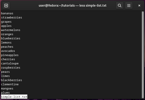 Schauen wir uns unsere simple-list.txt-Datei durch weniger an: