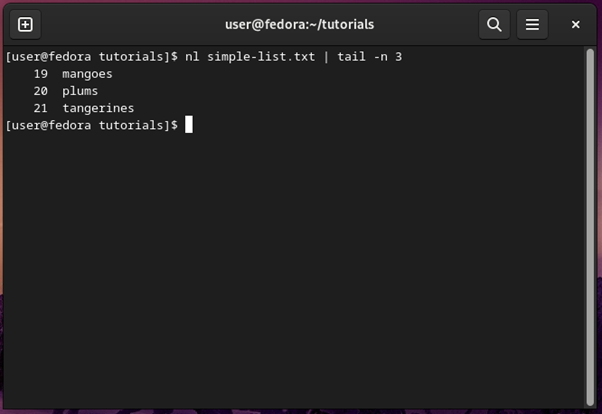 $ nl simple-list.txt | tail -n 3 19 mangoes 20 plums 21 tangerines