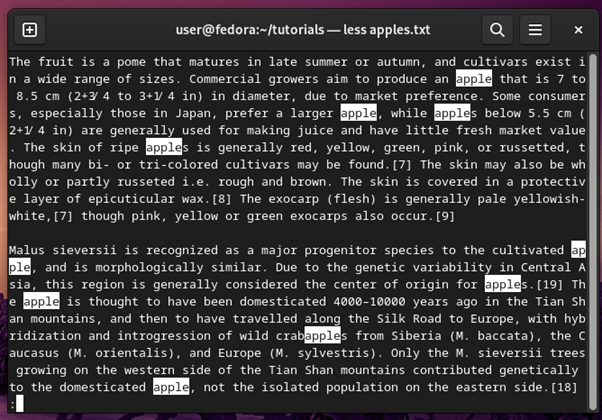 $ less +/target-word /path-to-fileUm beispielsweise die Datei apples.txt beim ersten Vorkommen des Wortes Sorte zu öffnen, würde der folgende Befehl verwendet werden: