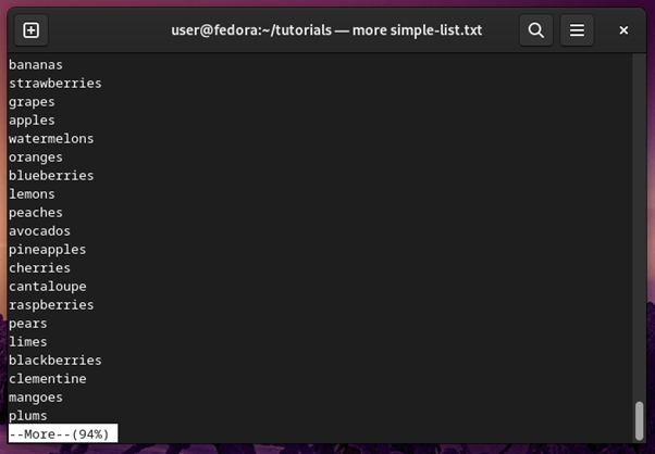 Der Befehl more bietet jedoch eine viel einfachere Möglichkeit, längere Dateien anzuzeigen, die nicht vollständig in das Terminalfenster passen.
