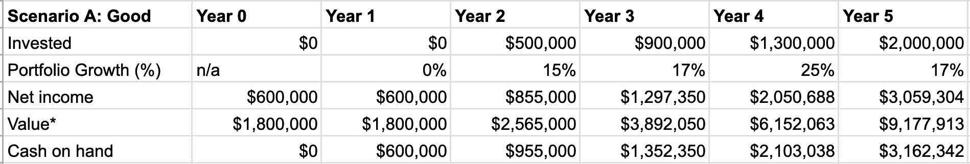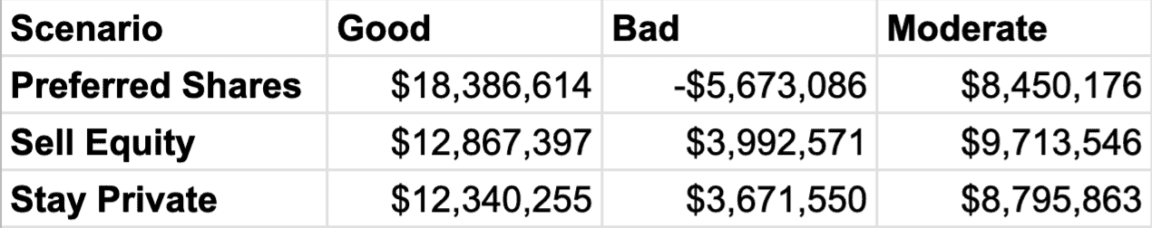 Ich vermute in Wirklichkeit, dass der Verkauf von Aktien zu einem höheren Multiplikator für die Bewertung führen könnte, aber ich möchte, dass diese Analyse ziemlich konservativ ist.