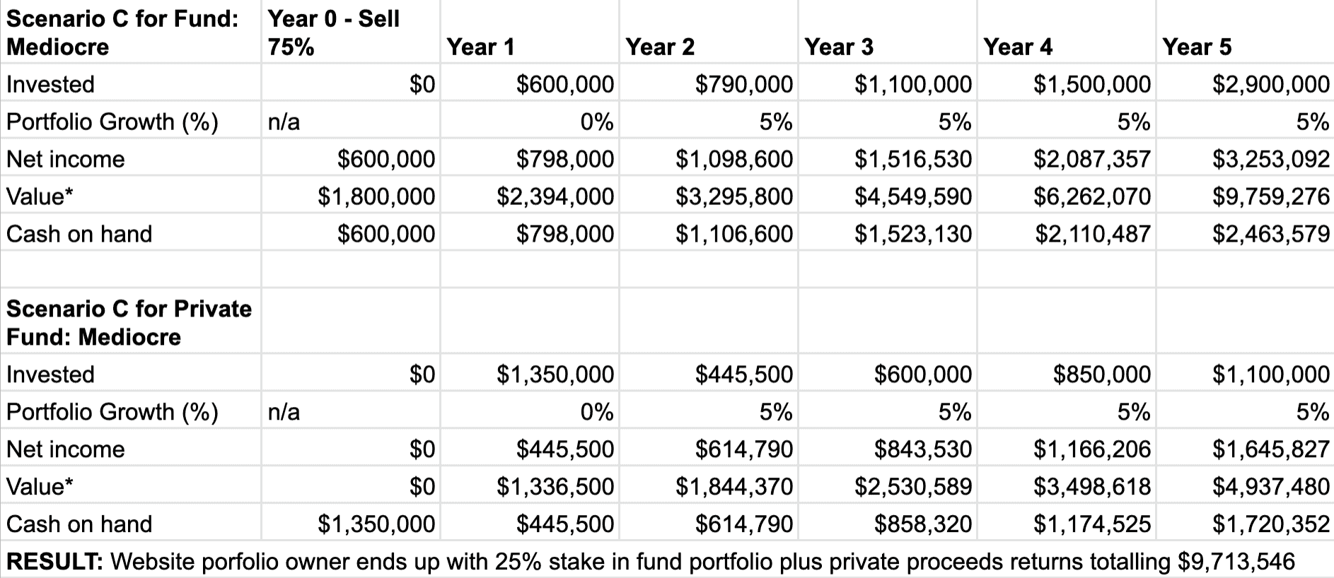 ERGEBNIS: Der Eigentümer des Website-Portfolios erhält am Ende 25 % des Fonds plus private Erlöse in Höhe von insgesamt 3.992.571 $