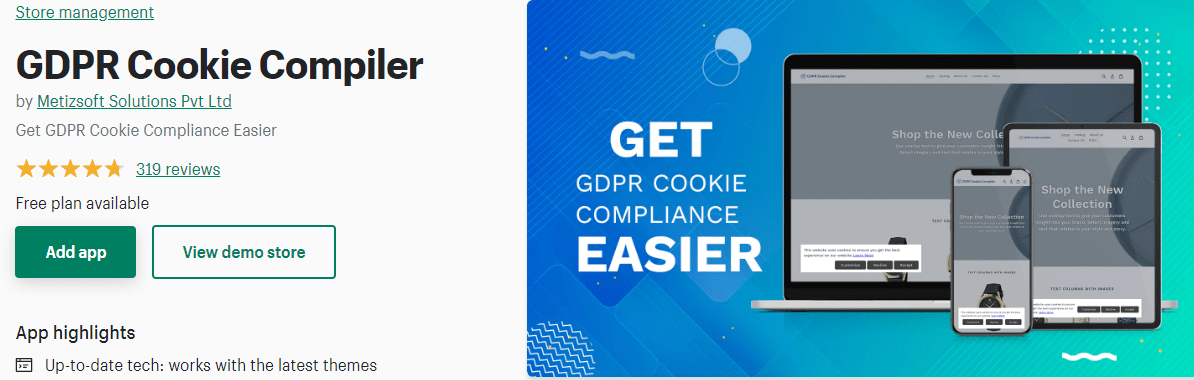 El Centro de cumplimiento de GDPR fue diseñado para los propietarios de tiendas Shopify para ayudarlos a manejar los detalles de la política de privacidad. Cuando instala y configura la aplicación, informa a los clientes que su tienda utiliza cookies. Luego los dirige a donde pueden seleccionar sus preferencias.