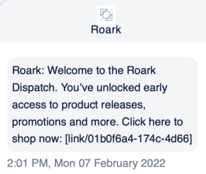 Entonces, cuando se comunique, verá un mayor número de cancelaciones de suscripción. Use un texto de bienvenida inmediatamente después de que se suscriban como una oportunidad para establecer expectativas y comenzar la relación con una nota positiva. Este texto de Roark Dispatch es un gran ejemplo: