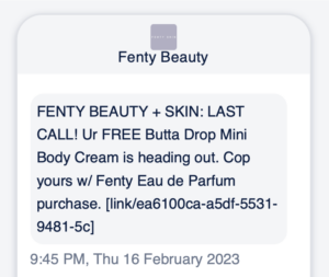 Si tus correos electrónicos están escritos de manera casual, tus textos también deberían serlo. Por ejemplo, este texto de Fenty Beauty adopta un enfoque más informal, y está bien, ya que es consistente con la voz de su marca.