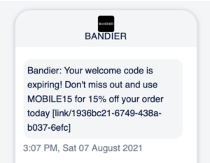 Una palabra final sobre los mensajes de bienvenida: si ofrece un cupón u oferta de bienvenida, asegúrese de recordárselo a los suscriptores antes de que caduque, como lo hace Bandier aquí.
