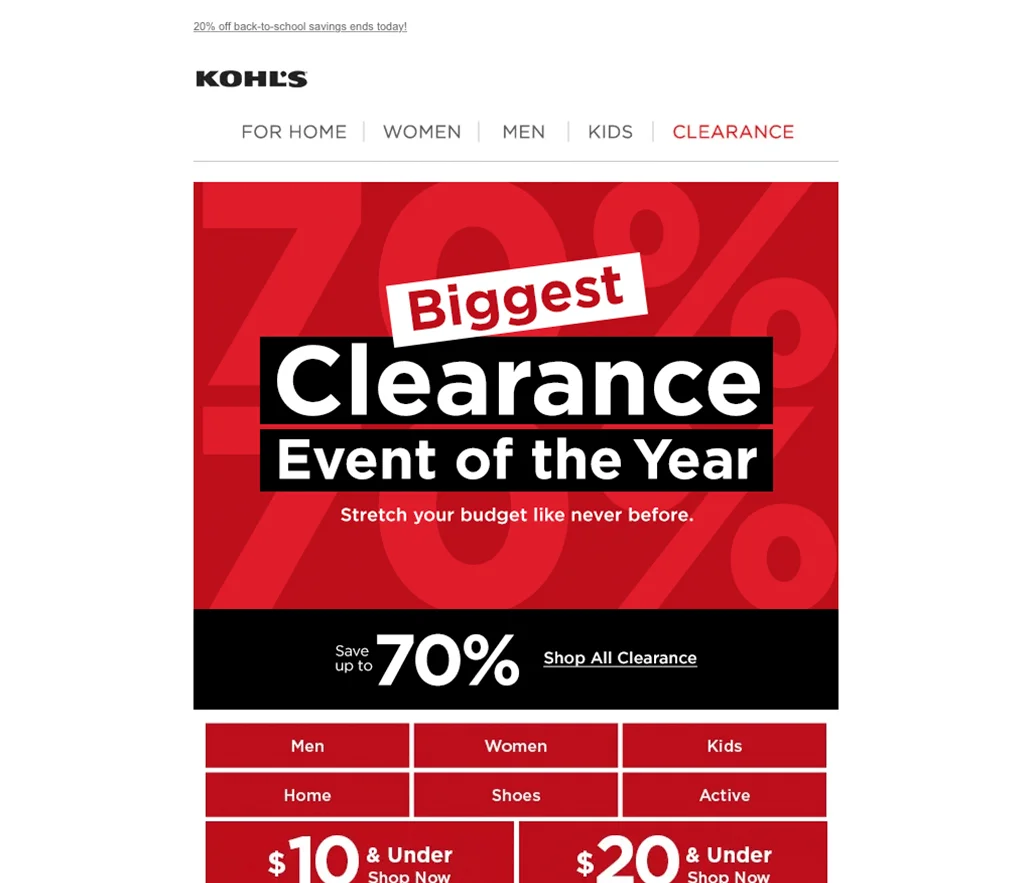 La campaña de correo electrónico de Kohl utiliza texto y colores en negrita para llamar la atención y convencer a los posibles clientes. Los colores principales utilizados en esta plantilla incluyen rojo, negro y blanco, cada uno con un propósito específico. Mientras que el blanco se usa para el fondo, el rojo se usa en la parte superior y los botones aparecen en negro.