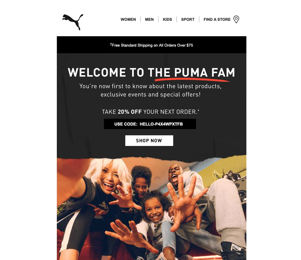La campaña de marketing por correo electrónico de la marca Puma es emocionante y utiliza múltiples imágenes para enviar un mensaje impactante. Cada imagen tiene un botón blanco que permite a los clientes ir directamente a una página de producto diferente en el sitio web.