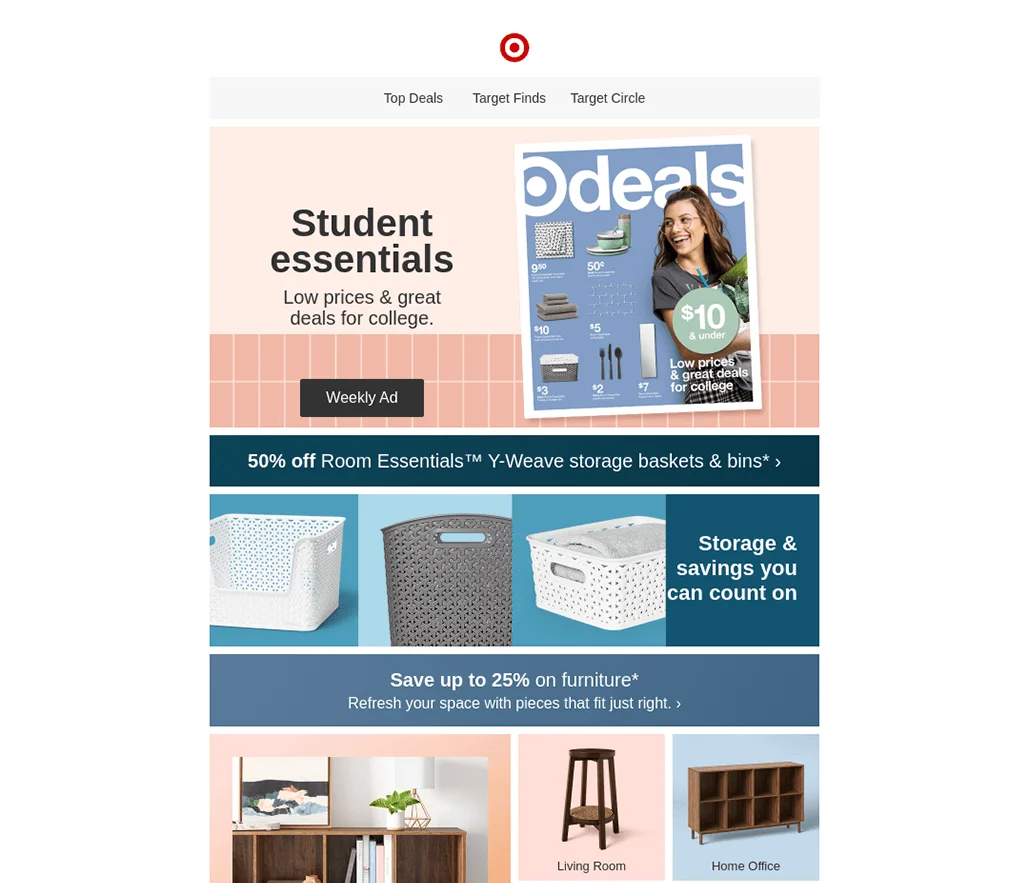 Mostrar los productos disponibles a los clientes potenciales es un enfoque probado para muchas marcas, como Target. La mayor parte de su mensaje de correo electrónico se divide en múltiples segmentos, cada uno con una categoría de producto separada, con múltiples tonos de rojo y azul que ayudan a distinguir cada segmento.