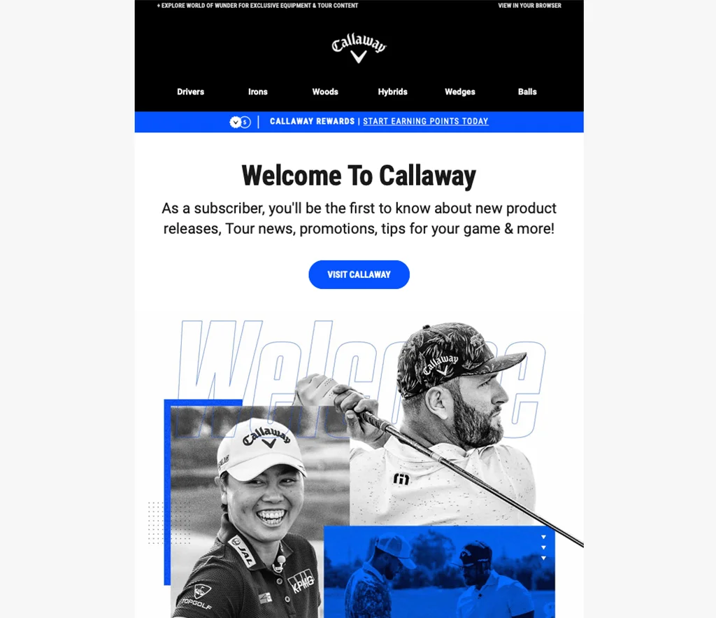 La campaña de marketing por correo electrónico de Callaway utiliza tres colores que se complementan entre sí y crean un diseño atractivo pero sofisticado. La parte superior tiene un banner negro con enlaces a varias páginas del sitio web, mientras que ciertas secciones y botones aparecen en azul en la base blanca, ayudándolos a destacar.