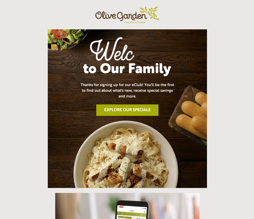 La campaña de marketing por correo electrónico de Olive Garden simplifica las cosas sin sacrificar ningún elemento de atractivo. Debajo del logo de la marca en la parte superior, hay una imagen de los platos que los clientes pueden pedir. A esto le sigue otra imagen que muestra la aplicación del teléfono inteligente y el enlace para descargarla.