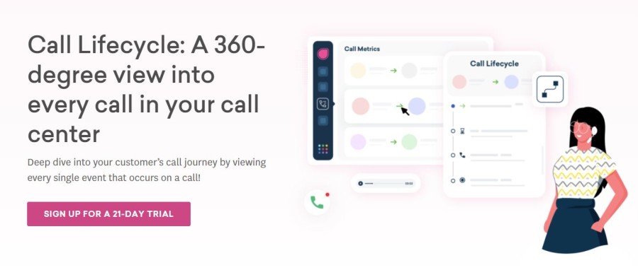 La función del ciclo de vida de la llamada proporciona detalles como el nombre de la persona que llama, el agente que respondió a su llamada, si la llamada se transfirió o no, cómo se desarrolló la llamada, cualquier cargo adicional por llamada y el motivo, etc. Además, puede identificar hasta 50 eventos en sus llamadas entrantes y salientes para comprender la efectividad de la llamada.