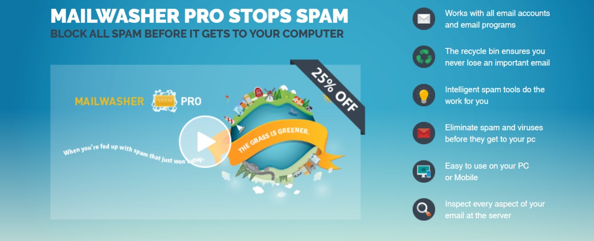 MailWasher bloquea todos los mensajes de spam antes de que lleguen a su bandeja de entrada. Funciona con todas las cuentas y programas de correo electrónico y ofrece una papelera de reciclaje que garantiza que no se pierda ningún mensaje importante. También presenta herramientas de spam inteligentes e inteligentes para hacer su trabajo y evitar que sus mensajes reciban amenazas no deseadas.
