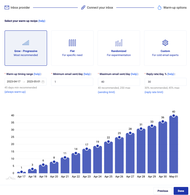 Aquí es donde entra en juego la preparación del correo electrónico. El calentamiento del correo electrónico implica aumentar gradualmente la cantidad de correos electrónicos enviados para establecer una reputación positiva como remitente a lo largo del tiempo.