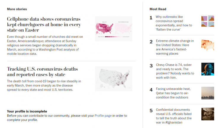En la parte inferior de cada artículo en el sitio web del Washington Post, los usuarios son atraídos por historias relevantes al que el lector acaba de completar, así como por los artículos más populares en el sitio, y por una buena razón. Los sitios web de noticias están particularmente incentivados para mantener a los usuarios leyendo y participando en el sitio, porque más vistas de página equivalen a más ingresos publicitarios. Las organizaciones sin fines de lucro también pueden usar este enfoque para crear conciencia y afinidad con la marca.