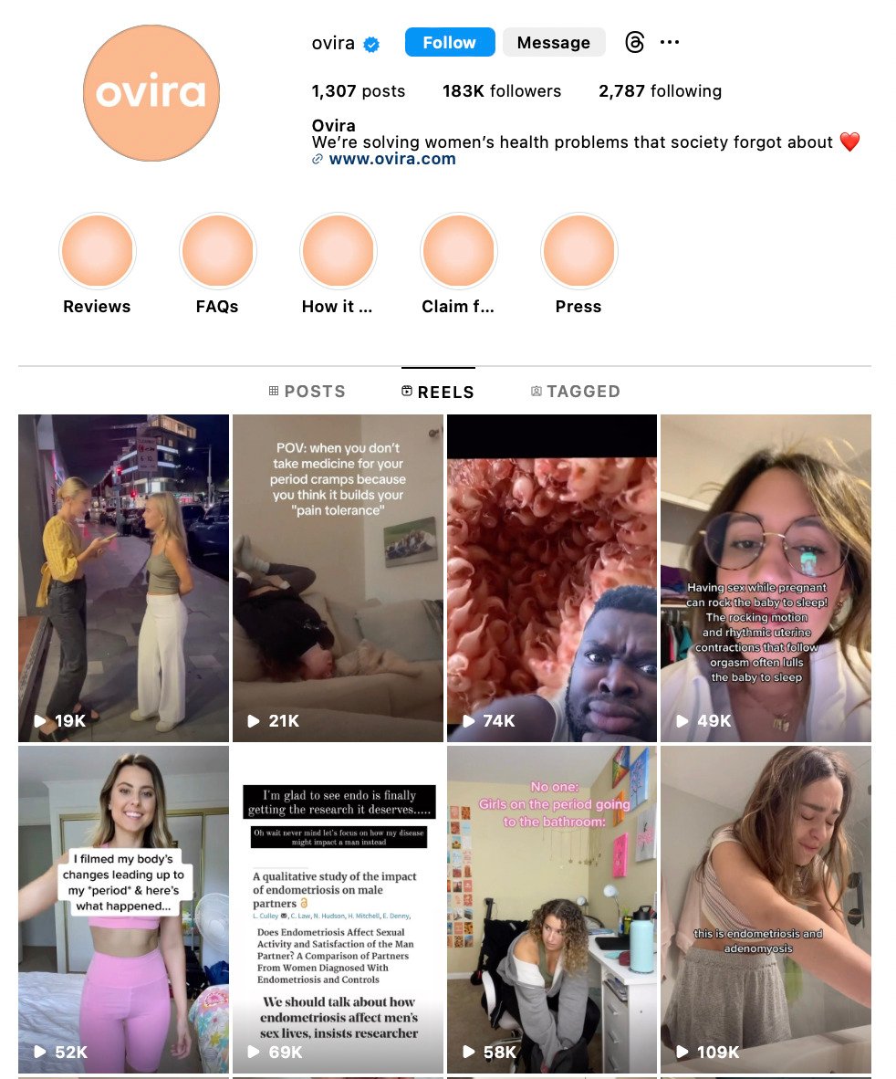 Por ejemplo, Ovira , una empresa que fabrica un dispositivo para aliviar los calambres menstruales, produce vídeos cortos en Instagram para educar e informar sobre la salud y el cuerpo de las mujeres. El medio visual de esta marca es mucho más eficaz que simplemente publicar fotografías con títulos largos.