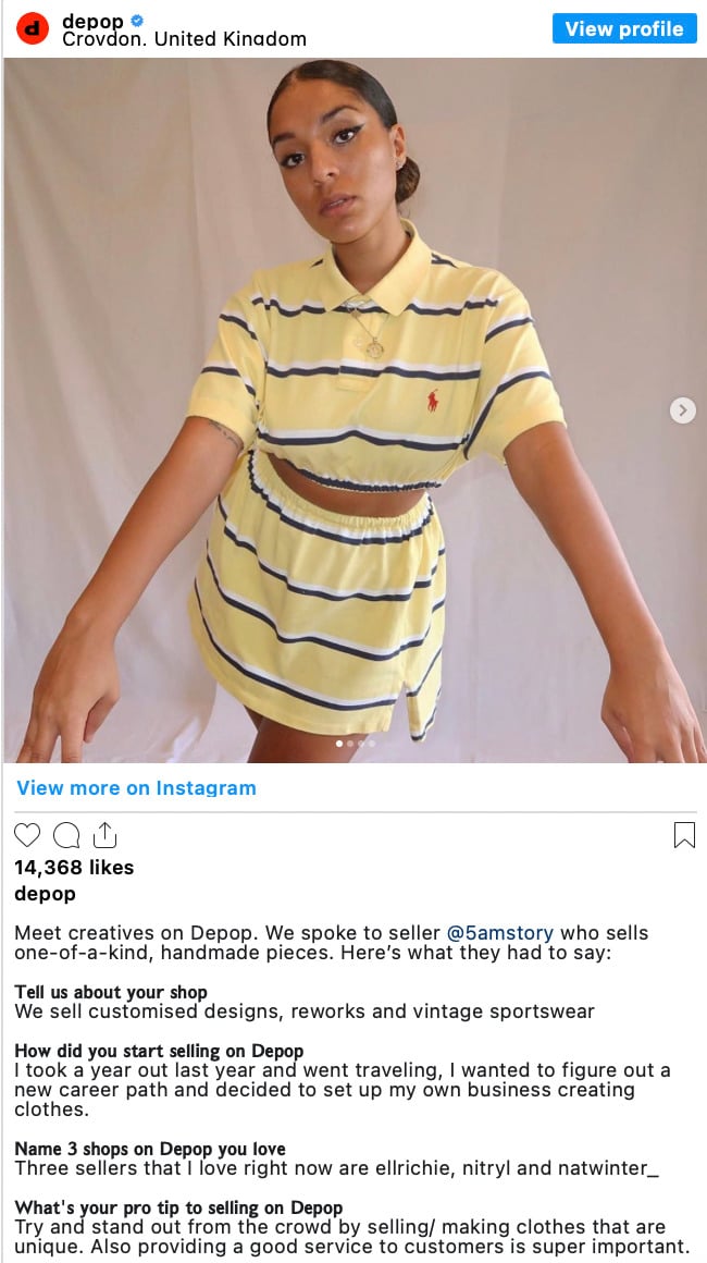 La plataforma de venta social Depop, por ejemplo, ha tenido mucho éxito en Instagram . Su estrategia principal consiste en volver a publicar contenido del propio sitio Depop, hacer un poco de marketing de influencia y publicar anuncios pagos además de eso. Su cuenta de Instagram tiene como objetivo inculcar una sensación de FOMO en los usuarios, incitándolos a regresar a Depop tanto como sea posible.