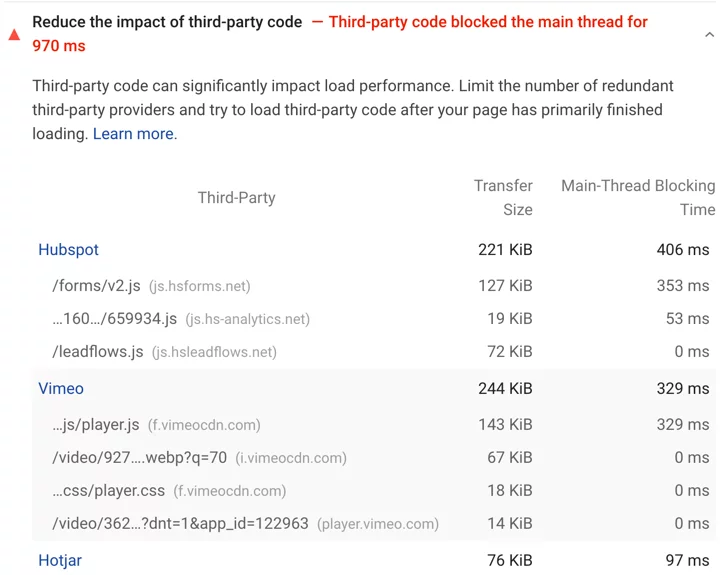 JavaScript puede venir en todas las formas y tamaños y no es raro que una sola inserción de video, widget de chat, script ReCaptcha o integración de HubSpot sea la única causa detrás de las métricas altas de FID, TTI y TBT.