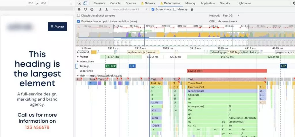 En el sitio de Hallam en el ejemplo anterior, el Monitor de rendimiento muestra el LCP como el encabezado principal 'Prosperar en línea'. Idealmente, LCP debería seguir inmediatamente a FCP como en este ejemplo y si hay una brecha entre los dos, debemos intentar comprender por qué.