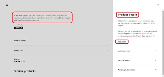 anuncios Aún mejor es ocultar detalles específicos, como hace Ikea en su sitio web. En la captura de pantalla a continuación, puede ver una breve descripción y dos secciones más: "Detalles del producto" y "Tamaño del producto".