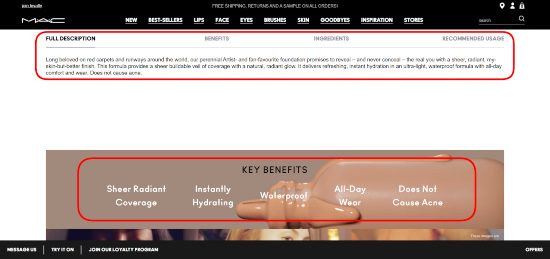 anuncios Eche un vistazo a la siguiente captura de pantalla del sitio web de MAC. La marca presenta su nueva base y brinda todos los detalles importantes sobre los ingredientes, el uso y las ventajas principales. Pero, para hacer que estos puntos esenciales sean aún más visibles, MAC diseñó un diseño separado con una fuente más grande y una foto de fondo. Ahora todo el mundo nota estas palabras clave.