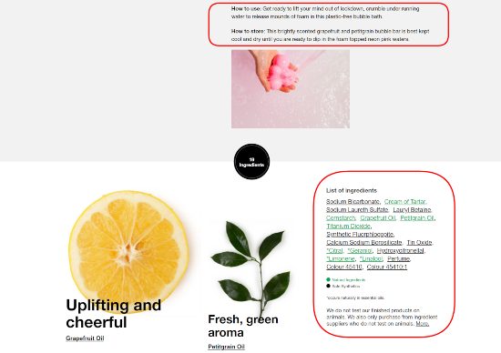 Lush aprovecha con éxito este enfoque incluso dando enlaces a cada ingrediente de sus bombas de baño. Echa un vistazo a la captura de pantalla a continuación. Puede hacer clic y leer las descripciones completas y asegurarse de que este producto sea seguro y adecuado para usted.