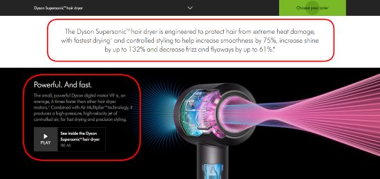 En la captura de pantalla a continuación, puede ver cuán sabiamente Dyson abordó la explicación de las tecnologías detrás de su famoso secador de pelo. Brindan algunas estadísticas, hechos sorprendentes y lo invitan a ver el video para obtener más información. Eso es suficiente para entender el concepto.