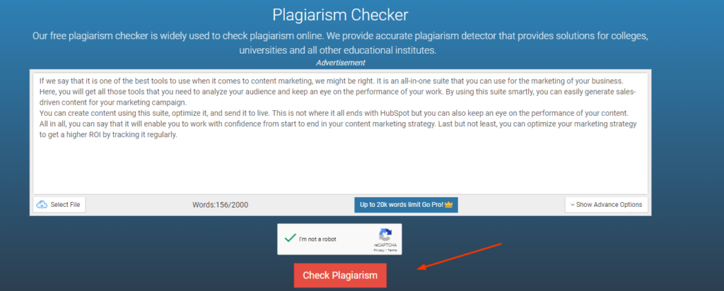 Esta herramienta ha sido diseñada con una interfaz simple y un concepto de trabajo de un solo clic. Solo tiene que insertar su texto en el cuadro indicado y hacer clic en el botón " Comprobar plagio ".
