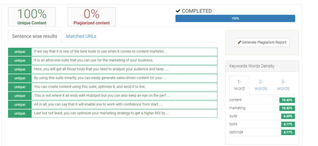 Comparará su texto con todas las páginas, documentos, artículos y blogs publicados. Después de la comparación, le mostrará los resultados en formato línea por línea con etiquetas únicas y plagiadas.