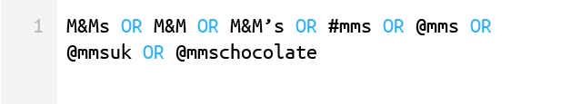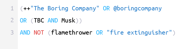 Este operador busca una o ambas palabras clave enumeradas. Tenga en cuenta que todos los operadores se pueden utilizar varias veces dentro de una consulta. En este ejemplo, agregaremos un identificador de redes sociales, que se escribe como una sola palabra. Esto nos permitirá monitorear las conversaciones en las que las personas etiquetan a la empresa. Luego, también podemos agregar el acrónimo 'TBC'; no se usa con tanta frecuencia, pero lo incluiremos por ejemplo.