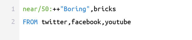 Imaginemos que hemos decidido monitorear las noticias sobre 'Boring Bricks' producidas por la compañía a partir de los ejemplos anteriores. Una investigación rápida muestra que, en los informes de noticias, estas palabras generalmente aparecen en un orden diferente y la distancia entre ellas también es diferente. Elijamos la distancia segura de, digamos, 50 palabras y veamos si obtenemos buenos resultados en Twitter, Facebook y YouTube.