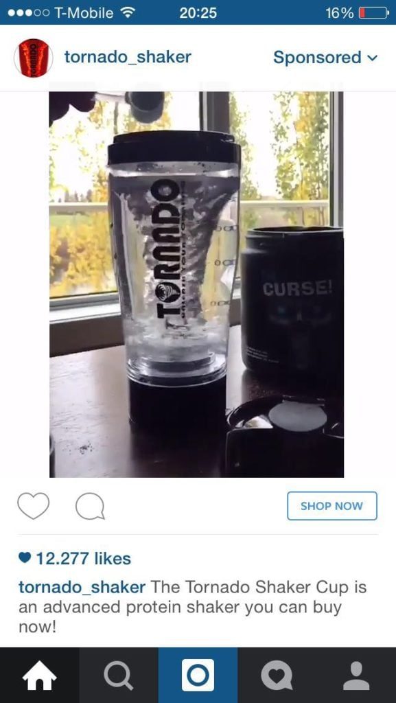 Hay varias formas de construir una marca a través de la publicidad de Instagram. Una forma de hacerlo es mostrando los activos de su marca directamente a través de anuncios. En este ejemplo a continuación, un vendedor de vasos mezcladores demuestra la utilidad y la marca de su producto en un solo mensaje.