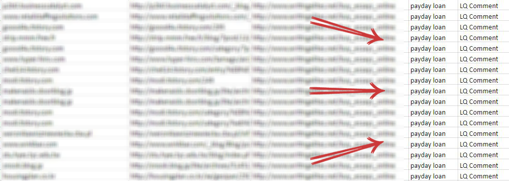 Este fue el paso clave de este proyecto. Estaba buscando enlaces y noté una gran cantidad de comentarios spam de baja calidad. Hubo 112 de ellos o el 30% de todos los backlinks, para ser exactos.