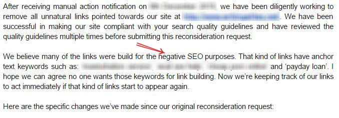Esta es la parte donde le explicamos a Google lo que sucedió. Es mejor ser honesto y natural, solo imagina que le estás explicando a tu amigo lo que sucedió. Por ejemplo: fui golpeado por una penalización de acción manual en * insertar fecha *. Encontré * número total de backlinks * enlaces, pude eliminar un * número de enlaces eliminados * enlaces y * número de enlaces activos * enlaces todavía están activos. Creo que me golpeó el SEO negativo porque * explicación *. Adjunto informe detallado y archivo de desautorización.