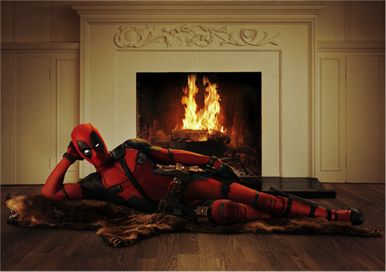 Cette image emblématique de Deadpool allongée sur un tapis en peau d'ours :