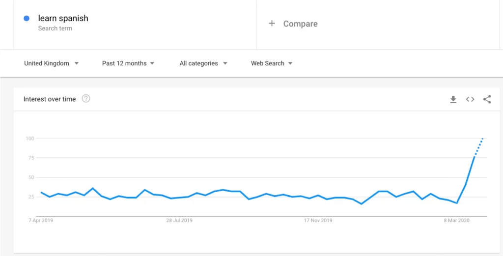 Par exemple, si vous êtes un fournisseur d'éducation, jetez un œil à ce qui intéresse votre public en ce moment. L'intérêt pour l'apprentissage des langues monte en flèche, ce qui peut être quelque chose que vous pouvez aider.