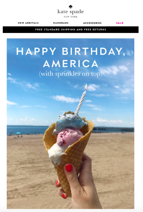 La ligne d'objet de l'e-mail "Joyeux anniversaire Amérique" de Kate Spade et une photo spontanée se démarquent de la boîte de réception bondée.