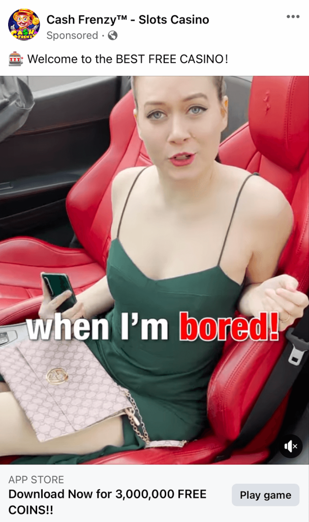 En ce qui concerne les jeux, en particulier ceux liés aux casinos et aux machines à sous, rien de mieux que d'utiliser des vidéos accrocheuses. Cash Frenzy Cash Casino l'a fait dans cette campagne Facebook en utilisant une vidéo de révision de l'un de ses utilisateurs réguliers. Nous aimons particulièrement l'utilisation de texte en gras avec des mots spécifiques surlignés en rouge car il attire l'attention des utilisateurs presque instantanément.