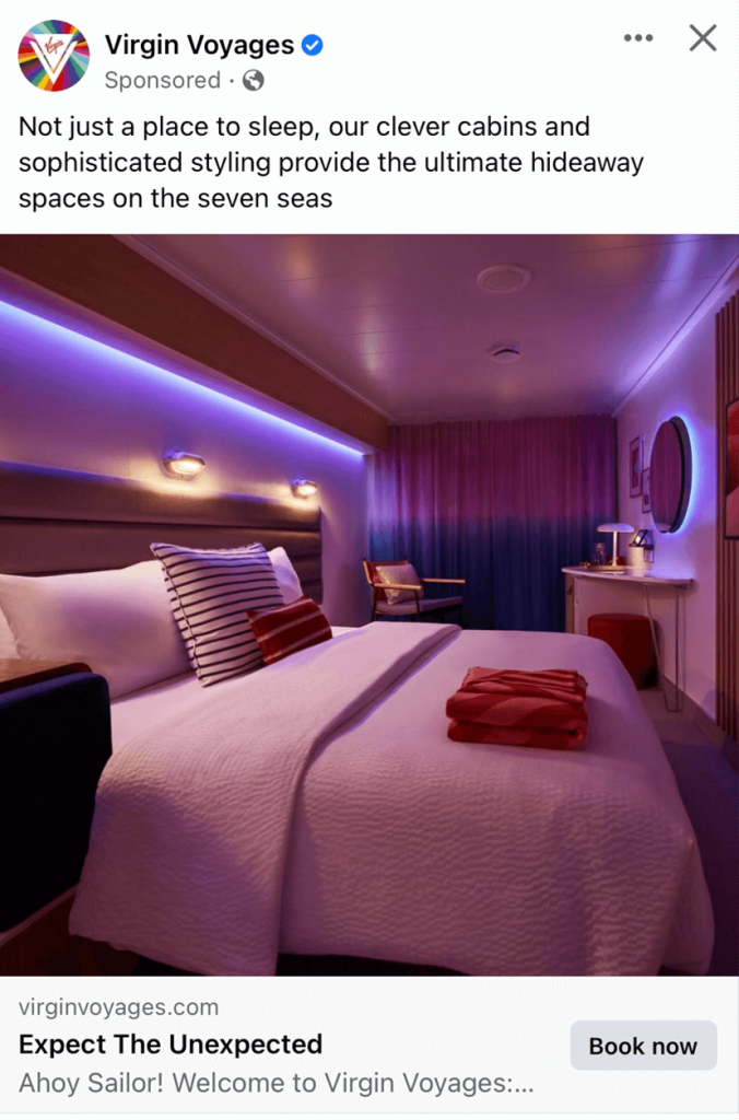 Lorsqu'il s'agit de réserver un hébergement, de nombreux clients préfèrent rechercher des options avec une ambiance appropriée. Dans cette campagne publicitaire sur Facebook, Virgin Voyages utilise une image attrayante d'une cabine d'une de ses croisières.